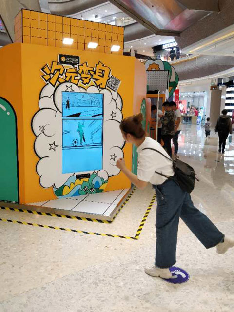 运用AR増强现实和影像捕捉技术。根据显示的每格漫画做不同的动作,玩家真实影像与漫画融合形成个性的漫画,最后生成一组漫画发送到手机,可发朋友圈。